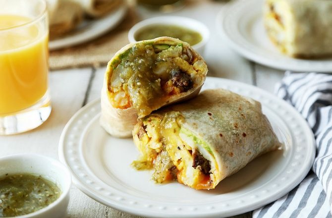 - Warm the tortillas in a dry skillet or on the stove over the gas burner to make them pliable and soft. Fill each with sliced avocado, the potato/egg mixture, and lots of cheese. Fold and roll into a burrito. Serve hot with salsa verde.