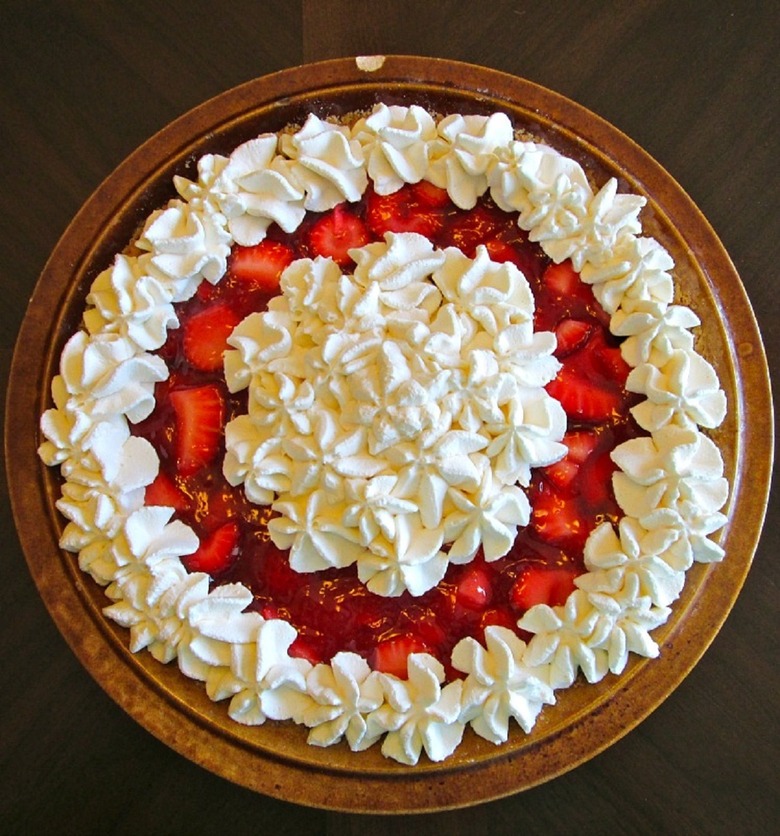 - Place the sugar, water, corn starch and gelatin in a sauce pan over high heat. Stirring constantly with a whisk bring to a boil. Turn off the heat, but leave the pan on the hot burner, and cook for an additional minute to thicken. Remove from heat and allow the filling to cool slightly on the counter.Rinse and drain the strawberries. Slice and put them in a medium bowl. Combine the slightly cooled gelatin mixture with the fresh strawberries. Put the mixture in the fridge (covered) while making the sweet whipped cream.Pour the cooled filling into the cooled crust.Do not cover at this time but place the pie in the fridge for about 30 minutes to set the filling.Enjoy!