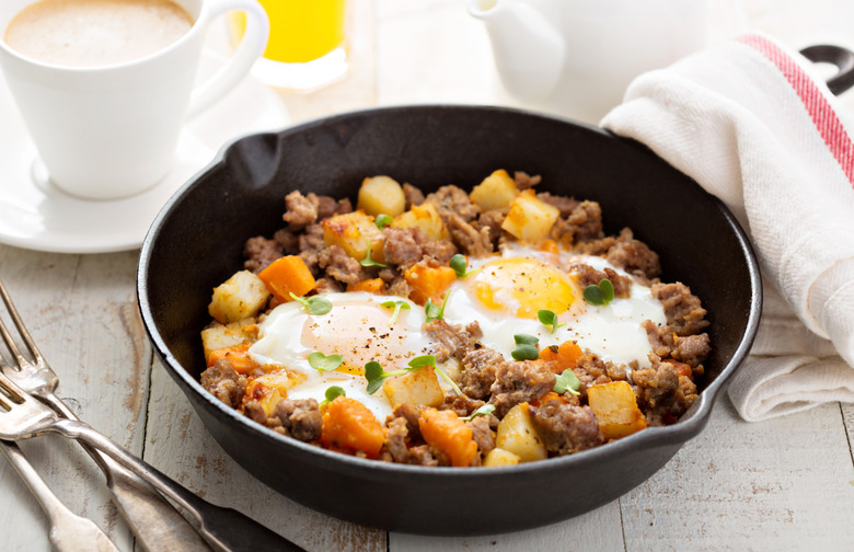 Make a hash with tender new potatoes, pungent spring garlic, and sweet peas. Then, top your vibrant vegetable base with farm fresh eggs for a sunny side-up morning fix.