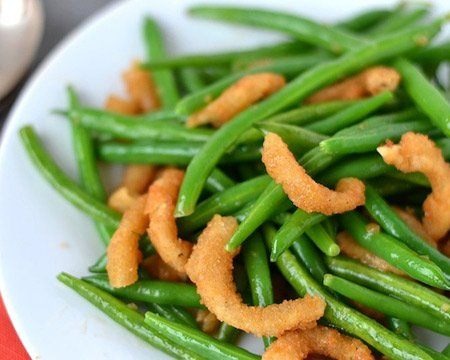 - Add the sweet and sour sauce and toss well. Cook for 1 minute. Add the string beans to a serving bowl and toss with onion rings to serve.