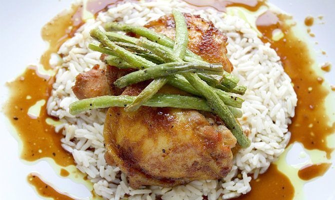 - Serve with rice and roasted green beans (toss the vegetables in olive oil, salt, pepper, and garlic powder, and cook in a 400 degrees F oven for 25 minutes).