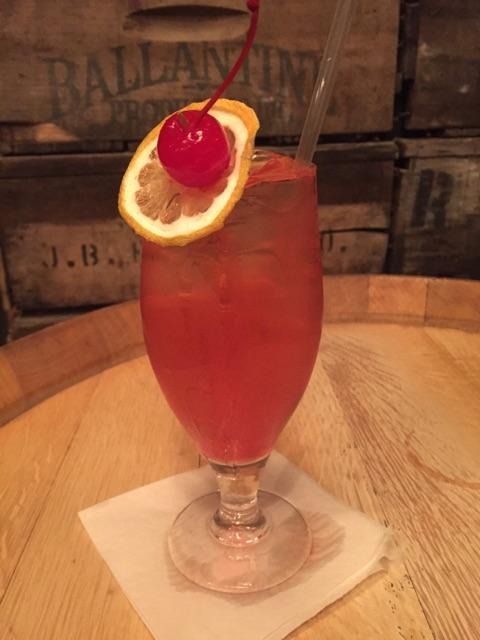 - Add all ingredients and shake. Serve in a stemmed beer glass. Top with local Q pink grapefruit soda and garnish with a cherry and dehydrated lemon