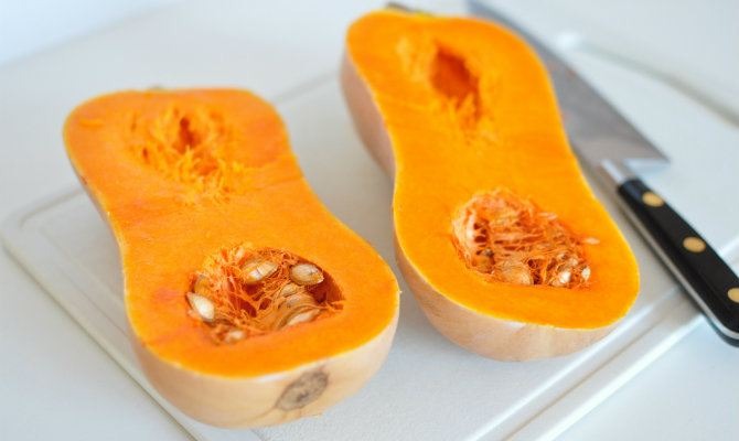 - Scoop out the seeds from each squash half and put them in a small mixing bowl. Scrape out most of the stringy pulp from the squash and discard. Spread ½ teaspoon of the butter inside each squash half and then season them with salt and pepper, to taste. Place the squash halves cut side down in a baking dish large enough to hold all 4 (divide them between 2 baking dishes if they don’t fit in 1 dish). Add enough of the water to go ½ inch up each squash half.