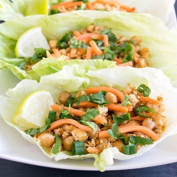 - 3 dry whole red chilies (seeds removed)¼ cup warm water1 tbsp. olive oil1 tsp garlic (chopped/paste)1 tsp ginger paste1 tsp white sesame seeds¼ cup white of green onions¼ cup julienned carrots2 tbsp. low sodium soy sauce2 tbsp. white vinegar2 cups crumbled tofu (extra firm)1 cup chickpeas (boiled and drained)3/8 tsp salt1 tsp pure maple syrup1 tbsp. chopped cilantroInstructionsSoak the whole red chilies in warm water for 10 minutes and grind into a smooth paste. Keep it aside.Heat oil in a nonstick pan/wok and add garlic, ginger and sesame seeds.Add scallions/green onions into the pan and sauté well.Add carrots and mix again.Add the prepared chili paste, soy sauce, and vinegar and mix very well.Add Tofu, mix, cover and cook for 2 minutes.Add chickpeas, salt and maple syrup. Mix and again cover and cook for 2 minutes.Lastly, add cilantro mix properly and turn off the flame.Serve the tofu chickpeas mix on the fresh lettuce leaves and top it with few drops of lemon juice.