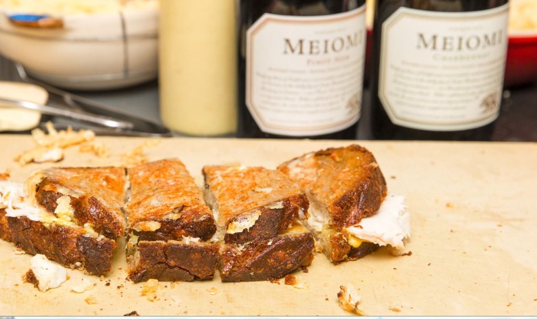 - Serving tip: If you are still entertaining guests, cut the grilled cheese diagonally and serve one half propped on top, with a side dipping cup of extra curry mayo. Enjoy with Meiomi Chardonnay!