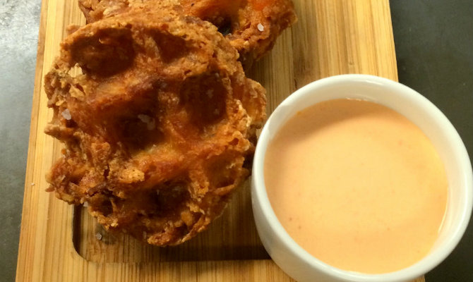 - To serve, place waffle tots on a plate and drizzle crème fraîche and sriracha sauce on top.