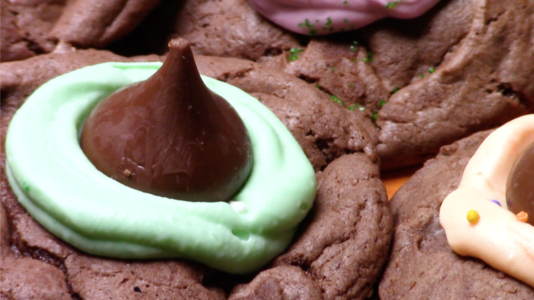 - Pipe 1-inch circle of frosting on top center of each cookie. Sprinkle frosting with candy sprinkles. Press 1 milk chocolate candy into frosting on each cookie. Store cookies tightly covered.