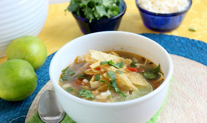 - Divide the soup into 4 large bowls, and garnish with cilantro, cheese and tortilla strips, as desired.