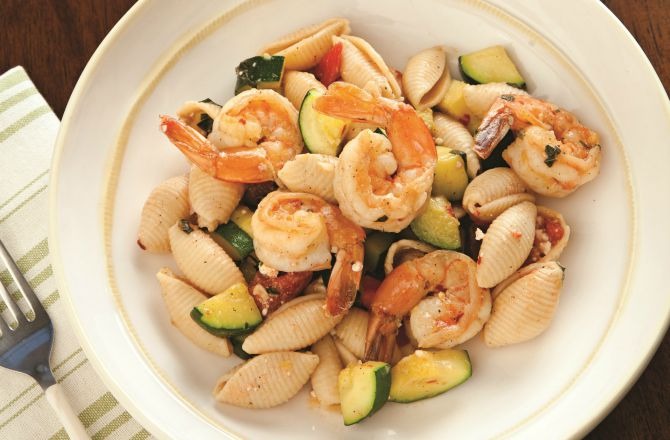 Low-fat seafood and whole-grain pasta come together for a flavor-bursting meal. The zucchini adds more fiber to this healthy dish.