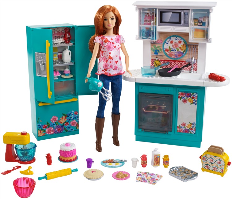 The Pioneer Woman doll has Drummond's fiery red hair and comes clad in a floral top, jeans and tall boots. And the playset comes with more than 30 accessories, including a mixer that really spins, colorfully decorated cake, rolling pin, and yellow toaster that really pops up the included toast.