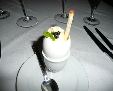 Salad of Heirloom Beets, Crab Meat, Cherry Wood Bacon, Mizuna, Quail Eggs with Black Eyed Pea Croutons.
