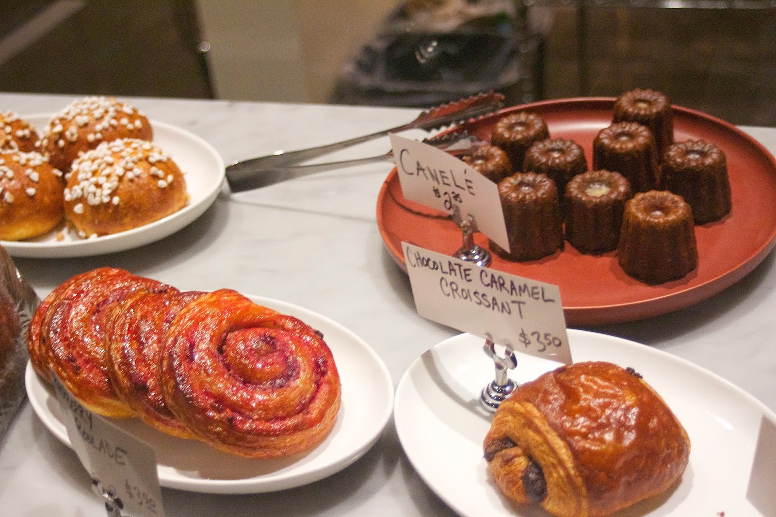 Trifecta's aforementioned threesome is restaurant, bakery, and bar. The spot is located in a surprisingly large space down a quiet and dark 6th Avenue in SE Portland, illuminated with a bright orange sign. There are two different entrances and hours, you can shimmy up to the bakery entrance that's a narrow space carved out of the much larger rectangular bar space. The bakery–open at 8am Wednesday-Sunday–has a variety of breads from Country Loafs, muffins, four different kinds of croissants, buns, lemon tarts, and much more to-go, while also producing specialties for the Trifecta dine-in menu.
