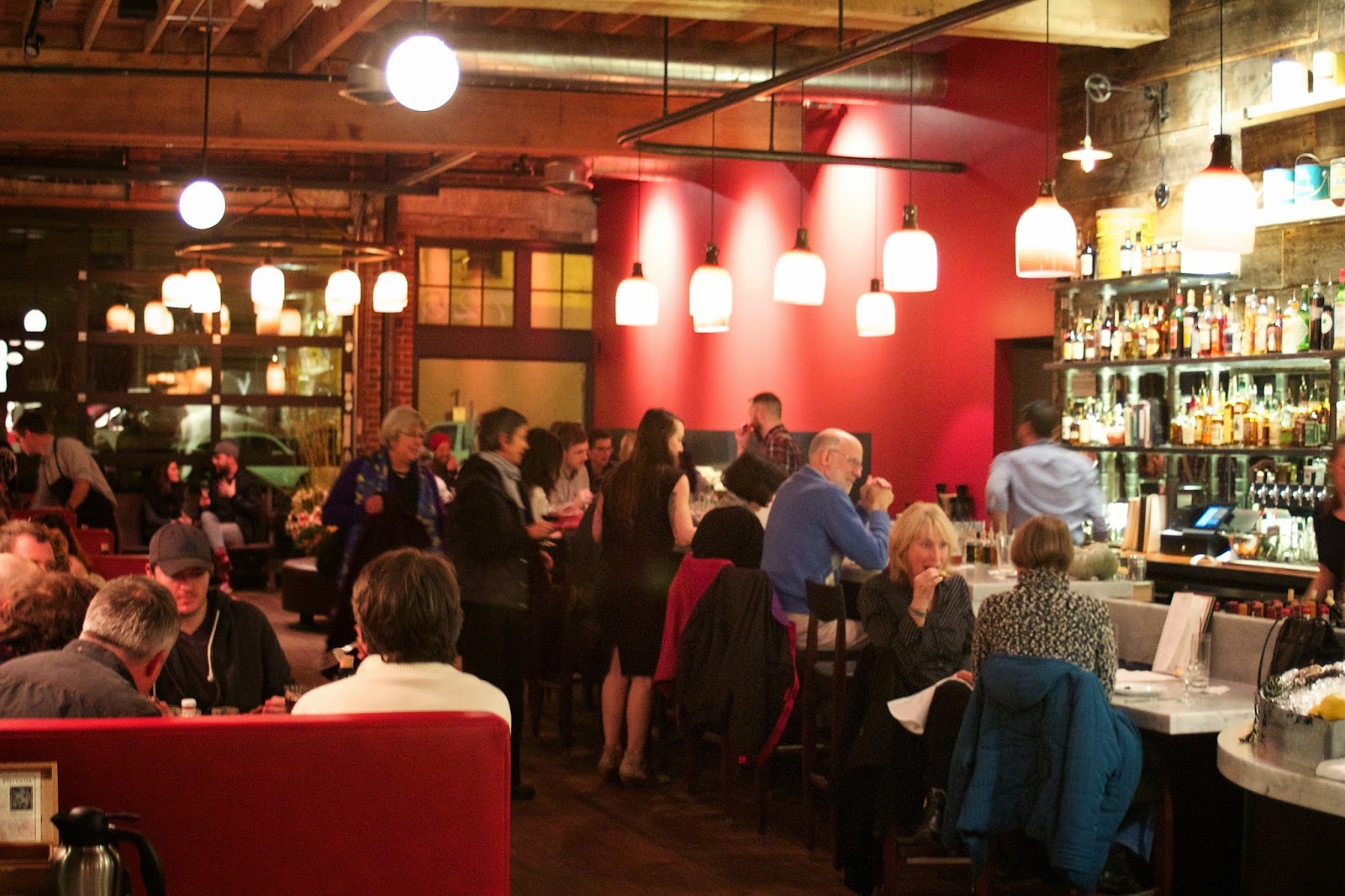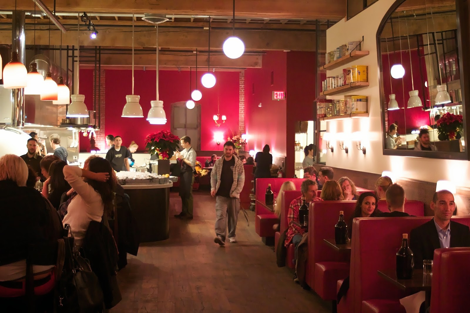 The bar/restaurant is apparently modeled after big city bars in places like NYC that force the patron into either a bar seat or booth, with no regularly seated tables. Really comfy and warm red leather booths line the wall, separating tavern from bakery all the way to the back of the room and around the corner. Each booth has its own romantic lamp and sparse decoration, usually built upon large mirrors and deep red colored walls that give an incredible warmth to the space. This is the type of place you want to cozy up in on a chilly or snowy day. Ken has put together an impressive open kitchen where you can see a small army of cooks working behind racks of wood and a seafood bar. Decor touches like rusty antique food cans and a giant heirloom squash sitting on the bar alert you with nod and wink that you're in a "gastropub," not some run-of-the-mill Pearl District rip-off.