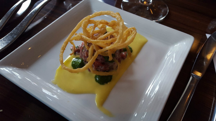 The menu, showcased by chef Jonathan Dearden, featured a variety of American modern dishes. To start, chef Dearden presented two appetizers. First was an heirloom tomato salad with whipped goat cheese, pickled blackberries, and almond brittle. The tomatoes were sweet, and, fun fact: Ardeo + Bardeo grow their own tomatoes. Chef Dearden believes that if you come to a bistro, you obviously have to try the tartar. The second appetizer was a short rib tartar with a hint of hot sauce, served with crispy onions. It was important to note that chef Dearden used a fattier cut than what you may typically see at other restaurants. He considers this to be the right cut, as to him it has the perfect amount of fat to provide flavor to the tartar.