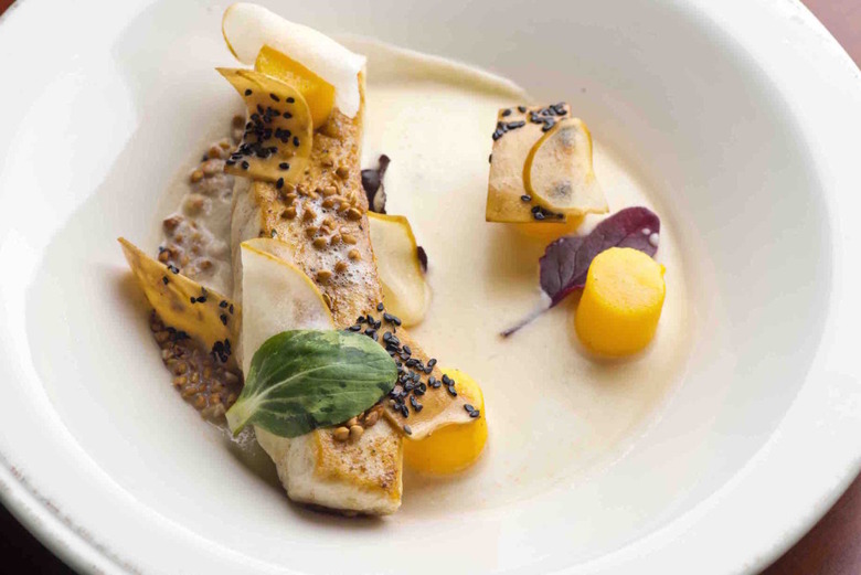 Another fantastic dish, which is also one of chef Berry's favorites, is "shellfish and stems." It sounds simple, but has layers of flavor thanks to a mix of fregola, stems from Swiss chard and various herbs (including parsley and tarragon), and a variety of shellfish, like squid and clam. It's topped with a seared scallop and a citrus sabayon.