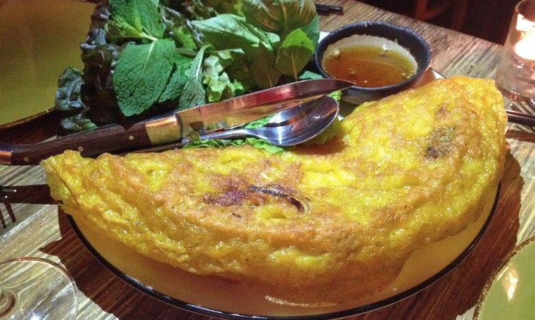 The meal started with a green papaya salad that was bright and refreshing, with a sour kick from lime and a hit of umami from fish sauce. It's a dish that can easily be thrown off-balance, but they nailed it. Next up were fresh summer rolls with shrimp, pork belly, rice vermicelli, mint, and cucumber, served with a sweet and spicy peanut dipping sauce. Two dishes so far, and two near-flawless interpretations of classic Vietnamese fare. Next was an ban xeo crepe, made with rice and tapioca flours, coconut milk, turmeric, and gluten free beer and filled with Carolina white shrimp, pork, onion, and bean sprouts that while also tasty (especially with the addition of a tangy fish sauce-based sauce on the side), could have used less sprouts and more shrimp and pork belly. A small bowl of housemade chicken pho with rice noodles and herbs served in-between courses was intensely chicken-y and a certifiable flavor bomb, in a very good way.