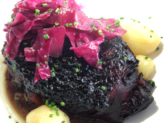 The French onion soup, for instance, is cream-based, and the coq au vin doesn't overwhelm the taste buds with burgundy. The chicken is fork tender and accompanied with bacon mashed potatoes and some rather unexpected but delicious melted red cabbage and pearl onions.