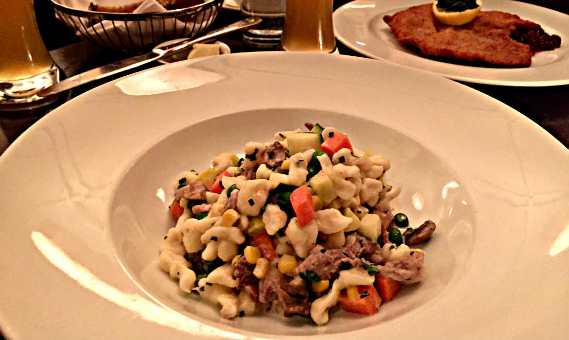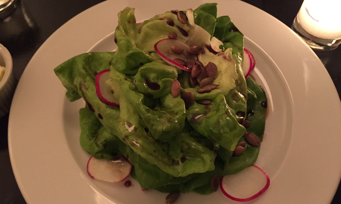 While sipping towering half-liters of Ayinger beer, we first enjoyed a refreshing salad of bibb lettuce, radish, and pumpkin seeds. "I'm not sure I have ever actually had fresh vegetables in an Austro-German restaurant before," remarked my companion, who spent the late 1960s living in Germany and has taken in an above-average amount of authentic fare of this kind over her lifetime.