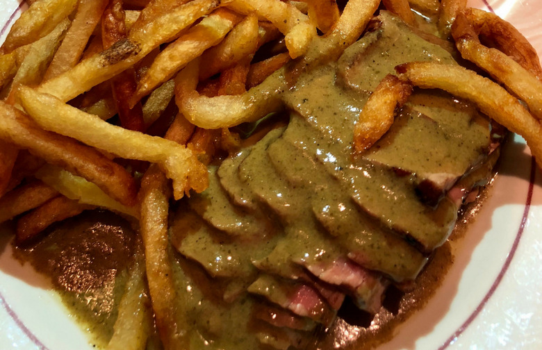 Then the steak appears, thinly sliced entrecôte, cooked precisely as you had ordered it. The famous sauce comes atop. Don't bother asking what's in the sauce; they're not going to tell you. But it's delicious enough so that some of us will end up scooping up whatever remains of it with a piece of baguette. Your plate will also include an inviting mound of frites, which you can accent with that strong French mustard if you so desire.
