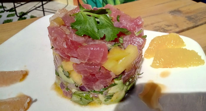 At a recent media event I got the chance to try some of the specialties from the brunch menu. Life started with a mimosa alternative: Casa de Moneda ($10) was a mason jar-enclosed cocktail of XO Reserve Rum seasoned with lemon, mint and agave. Homemade chips quickly followed. They are like crack on account of a dusting of chilies (guajillo, chile de arbol, ancho). To accompany them a platter of guacamole con totopos ($12), freshly made guacamole with a hash of bacon and basil drizzled in lime. This could see you through, but then you would be missing a lot of other good stuff. Tartar de Atun ($15, below) is the familiar ahi tuna, in this case diced and tossed with avocado, mango, and lime, all built in a tower for presentation. Light and well-balanced, this was also fun ladled on the crack chips.