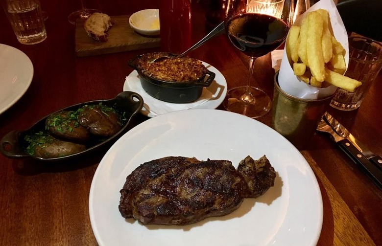 The restaurant, located on a quiet Covent Garden street, is dim and stately, with old iron pillars running the length of it, parquet floors, brick walls, and brick barrel-vaulted ceilings; there's also a large bar that was clearly a popular spot. The dining room has a buzz and energy unlike any other steakhouse I've been to with an even mix of suited businessmen and casual couple and families enjoying carefully sourced meat.