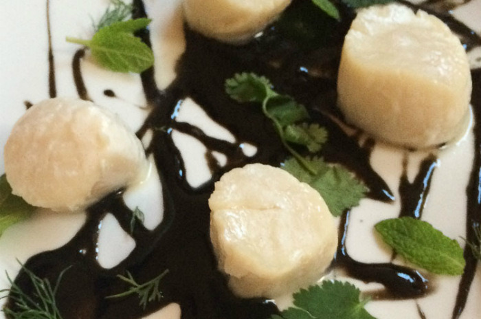 Coconut poached Alaskan scallops with squid ink adobo
