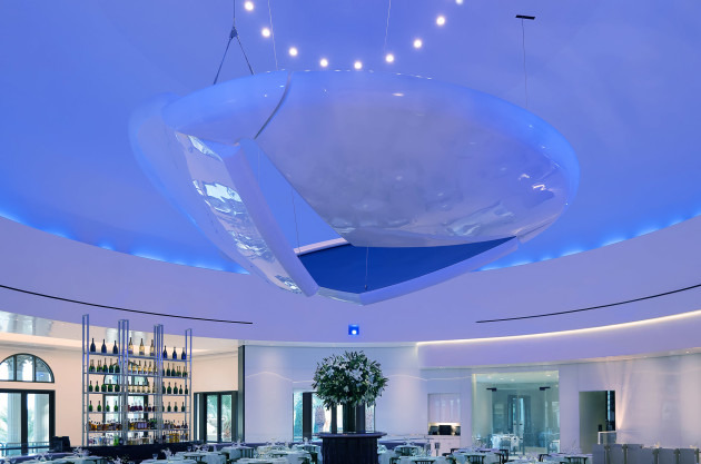 The new MR CHOW at Caesars Palace is definitely unique. Housed in the old Empress Court space, diners enter a small elevator off of the Caesars Palace casino floor and are transported to an all white dining room with a white floor, white tablecloths, and white waiter attire. It's a little sci-fi, especially when the weird kinetic chandelier/sculpture drops and inverts a blue hue over everything and everyone.