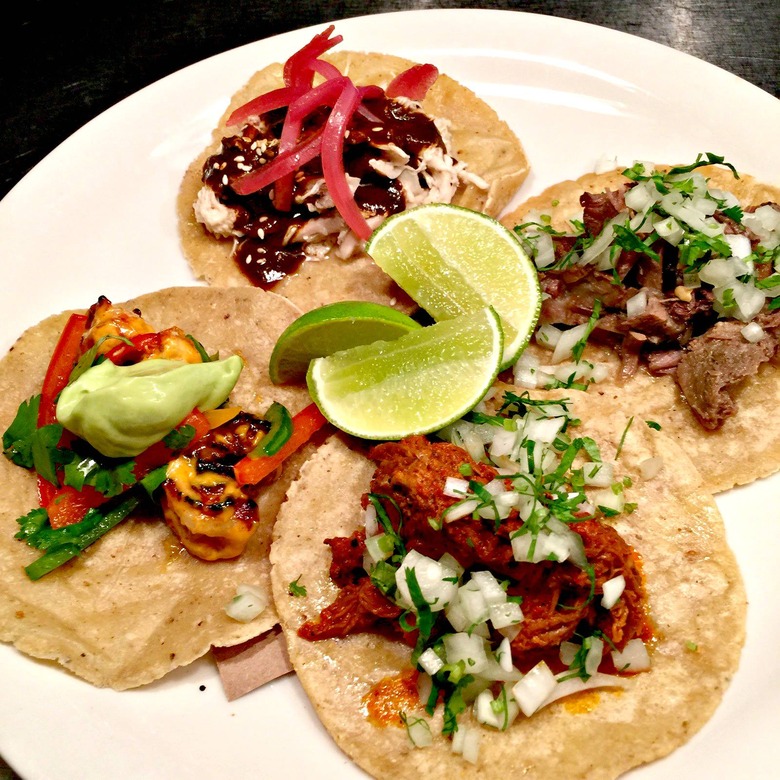 We continued our feast with a whole bunch of tacos — because there's never a bad time to indulge your taco cravings. Here's a rundown of what we had: the spit-fired al pastor with pineapple; the grilled shrimp with chipotle aioli; the fish of the day with cabbage slaw and crispy shallots (the shallots were perfection); and the chicken, with its rich house made mole.