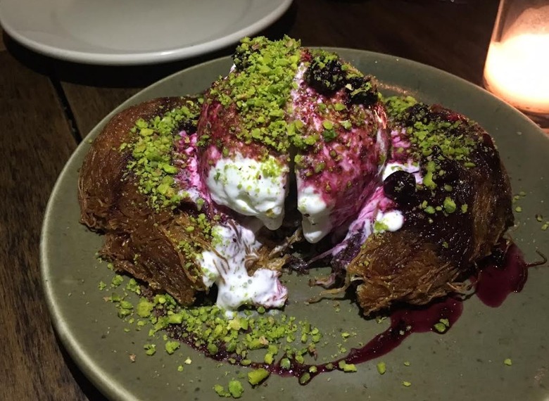 You can order a la carte or choose from two additional options: Tayim (salatim and hummus with laffa, two mezze, one al ha'esh, and dessert) and Mesibah (salatim and hummus with laffa, a selection of mezze, a special entrée to share, and dessert). When we visited, Mesibah entrée options were roasted lamb shoulder with pomegranate and chickpeas and slow-roasted and seared ribeye with romesco. We couldn't pass up the latter, and the thin-sliced steak was perfectly cooked, super-tender from the roasting process, and — no surprise here — insanely flavorful. Oh, and the selection of Israeli wines is one of the best you'll find outside of the country itself.