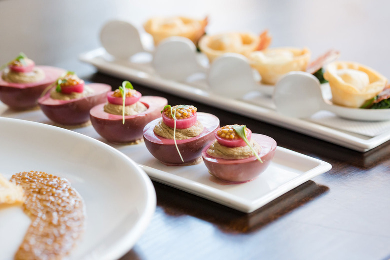 The menu is broken up into four sections: harvest, sea, land, and large plates. Chef Andrew Welch offers innovative takes on American classics. For example, deviled eggs are offered in two ways, neither of which are traditional: chicken liver mousse, pickled shallots, candied mustard seeds, and cilantro; and the "summer" deviled eggs with vibrant, beet brined eggs.