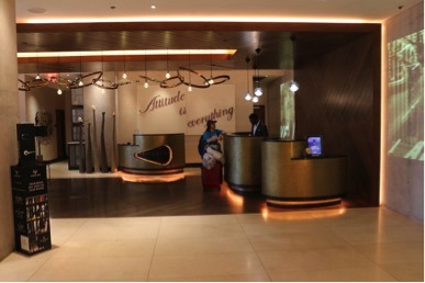 In comparison to its sister property in Times Square, The Renaissance Midtown appears less grandiose to scale, but no less impressive in its design. Tailored to business travelers the hotel's feels surprisingly less corporate than expected. Entering into the marble-floored lobby the space feels bright yet lavish. The property also boasts as New York's first 'digitally enhanced' hotel offering "ambient intelligence" features as block-length displays respond to guests' movement with changing patterns and graphics.
