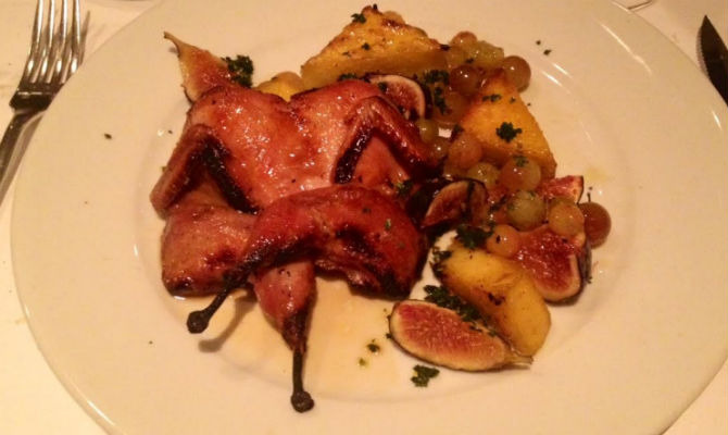 Another item that's not going anywhere is their Caesar salad, which I ordered as my appetizer. Surprisingly, it was overdressed when brought to my table, but at the slightest mention of it a new one was brought, which had just the right balance of crisp whole romaine and lemony, umami-rich dressing. For my entrée, I had to try something from the wood-burning oven, so I opted for a roasted quail with black Mission figs, Bronx grapes (which are sold at the Ferry Building farmers market during the month of August but are otherwise hard to find), polenta, fennel seed gremolata, and marsala sauce. The quail was perfectly cooked, juicy and crispy skinned, and the polenta triangles picked up a smoky note that perfectly complemented the fresh figs and grapes.