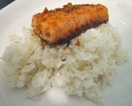 - Place the salmon under the broiler and cook until the fish flakes easily but is still moist throughout, about 5 minutes. Remove from the broiler and brush on the sauce while still hot. Serve immediately with cooked white rice.
