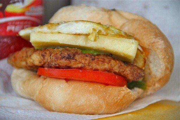 The salt bread (named thusly because many other Bajan breads are sweet) has a thin crust and a chewy interior. Inside, the juicy fish steak has a very light, peppery breading and wet flakes. You get a choice of fried egg, or cheese (Anchor New Zealand Cheddar, the cheese found everywhere in local grocers').