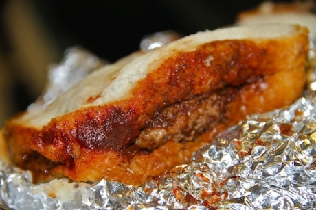 The pig burger might not sound like much, and it doesn't look like much when it arrives wrapped in foil (like much here), whether ordered to go or for there. And because there's just one table, almost everything ends up being ordered to go. When you open the foil, the pig burger still doesn't look like much. It's just two slices of white bread containing some grilled onions, barbeque sauce, and a pork patty.