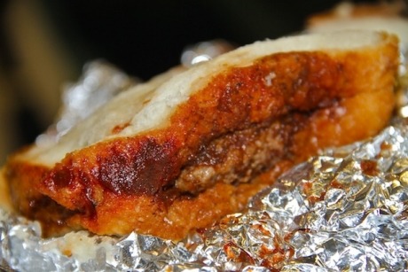 The pig burger might not sound like much, and it doesn't look like much when it arrives wrapped in foil (like much here), whether ordered to go or for there. And because there's just one table, almost everything ends up being ordered to go. When you open the foil, the pig burger still doesn't look like much. It's just two slices of white bread containing some grilled onions, barbeque sauce, and a pork patty.