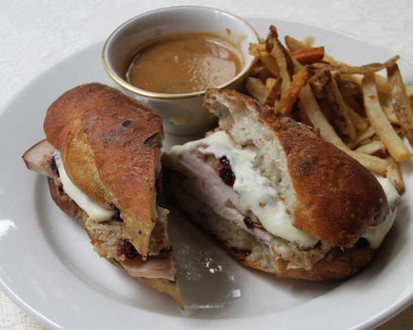 Chef Fox starts with a soft, crusty baguette, and layers on a few thick-cut slices of fresh-roasted smoked turkey breast. The turkey is then topped with a thin layer of fresh cranberry sauce and a couple of dollops of creamy mashed potatoes. Finally, stuffing gets added to the top, and the sandwich is served alongside a bowl of rich sage gravy for dipping.