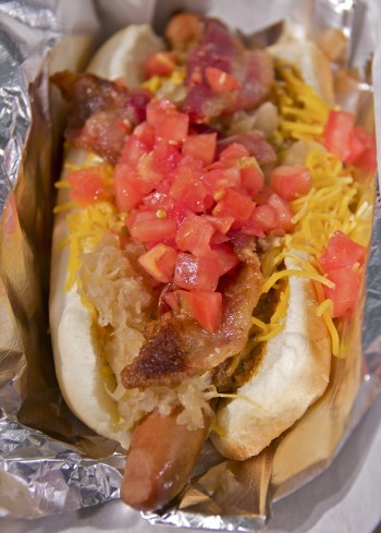 This, the eighth Pink's stand (and the first at an airport) serves up the LAX International Dog ($5.70). "It was designed by an airport employee in a hot dog creation contest held amongst all LAX employees," co-owner Richard Pink noted. "It is the most popular hot dog at Pink's at LAX. It is a 9-inch all beef, hot dog, topped with three slices of bacon, sauerkraut, shredded cheese and chopped tomatoes."