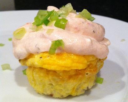 - Bake in the oven until the eggs are cooked through and golden brown on the top, about 15 minutes. Remove the egg cupcakes from the pan and let cool for about 10 minutes. Meanwhile, take the plastic sandwich bag out of the refrigerator and cut off one of the corners so that there is a ½-inch hole. Pipe the sour cream icing onto each egg cupcake, and top each one with the minced scallions.