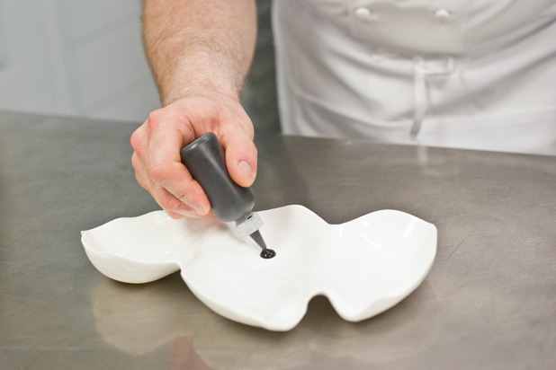 The signature dessert at Jean-Georges is the warm chocolate cake. It starts here with a drop of chocolate sauce.