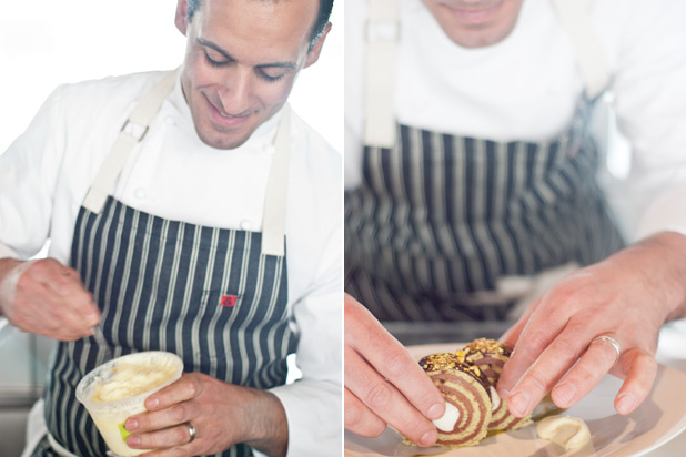 Chef Capizzi says of mastering pastry, "In pastry, it's more about mastering techniques than individual desserts. The techniques carry over to a myriad of different applications." He shows this in the Pistachio Genovese in his Girandola dessert.