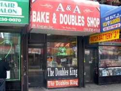6) A&A Bake and Doubles 481 Nostrand Ave., Bedford-Stuyvesant, Brooklyn; (718)230-0753, (daily, 6:30am-3pm). There's a line outside but A&A is also barely larger than an Amtrak bathroom. Still, it's one of the easiest places to reliably find Doubles into the mid-afternoon and you can even pay in T&T Dollars. Channa was decent— sweetened by mango chutney and spiced by hot pepper sauce. But the bara tasted inexcusably doughy. A&A's Doubles are passable, especially washed down with a Caribbean favorite, Solo Apple J Soda, but they don't reign supreme, no matter what their sign claims ("The Doubles King"). If you really want to cause some trouble, ask whoever is working behind the counter what "A & A" stands for. The folks at "D" Original A + A (The Doubles Man) contend that there was an agreement to change the name of the store when they sold it to the current owners several years ago and that they never told them what the initials stand for—the first names of the owners' children (we know the names but have been sworn to secrecy). B-