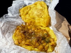 When it was finally time to decide who had the best Doubles in New York, we flip-flopped. While Bake & Things does not have any one component which would make our "Dream Doubles combination" (below) their Doubles met all our criteria for the perfect Doubles and were the best overall package. Though Terrence (above, right, collecting bags of Doubles) admitted, "I carry a picture of those Doubles around in my phone," he could not give them the number one spot on our list, contending that Royal's Doubles were "mood-changing."