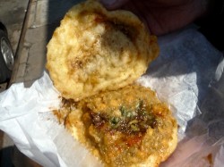 We discovered two schools of Double-making: Brooklyn Doubles are fluffier and more naan-like while Queens' are thinner and more like roti in color and texture. Brooklyn bara can be categorized by two subdivisions: light golden-colored fluffy bara similar to that found in Trinidad and a dingy, fluffy bara that seemed more influenced by Indian cooking. The former was more authentic and better tasting. We found Brooklyn Doubles to most resemble authentic Doubles from T&T but we did not grade New York's Doubles against Trinidad's. As good as New York's best were, they weren't expected to measure up to those made by an average Doubles vendor in Port-of-Spain or Arima. We would, however, throw our Dream Doubles Combination into the ring in a blind tasting bout against Trinidad's best.