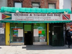 5) Justin's Island Cuisine 144 Lawrence St., Downtown Brooklyn; (718)625-9190, (Mon-Sun, 7am-9pm). This Guyanese/Trinidadian canteen, steps down from the street, runs out of Doubles ($1.50) by 1pm but its polourie (think, Trinidadian zeppole, $2/13pieces) are worthwhile. Doubles are served sandwich-style with hot pepper and tamarind sauce. Channa was spicy and featured thyme instead of shado beni. Bara were a bit pillowy but maintained structure. B