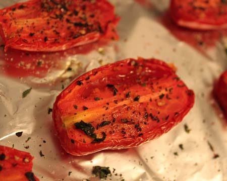 I love everything there is about tomatoes — I even eat them like apples. Everything, that is, except for sun-dried tomatoes. I don't know whether it's the chewy texture or the intense flavor (which doesn't taste like a tomato to me), but I really don't like them. It's the one ingredient that can steer me away from a dish. However, this recipe is as close to a sun-dried tomato as I can get. I only cook them for 2 ½ hours so that they still retain some of their juices but have a more concentrated flavor. If you'd like, you can continue to cook them for 3-4 hours total, so that they shrivel up and more closely resemble a sun-dried tomato (or oven-dried tomato rather). I use these in pastas, with grilled pork, steak, chicken, or quickly cooked fish. To be honest, I also just eat them as they are. Click here to see more Tasty Tomato Recipes.