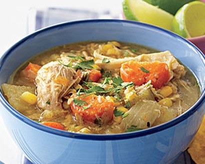 - Transfer the chicken to a plate and shred with two forks into bit size chunks; return to the slow cooker. Mix tortilla strips into stew. Serve warm.