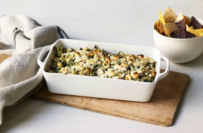 - Lightly coat an 8-in baking dish with nonstick cooking spray. Transfer the spinach-artichoke mixture to the prepared pan and sprinkle with feta.