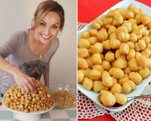 - Cut the dough into 4 equal-sized pieces. On a lightly floured surface, roll out each piece of dough until 1/4-inch thick. Cut each piece of dough into 1/2-inch wide strips. Cut each strip of pastry into 1/2-inch pieces. Roll each piece of dough into a small ball about the size of a hazelnut. Lightly dredge the dough balls in flour, shaking off any excess. In a large heavy-bottomed saucepan, pour enough oil to fill the pan about a third of the way. Heat over medium heat until a deep-frying thermometer inserted in the oil reaches 375 degrees. (If you don't have a thermometer a cube of bread will brown in about 3 minutes.). In batches, fry the dough until lightly golden, about 2 to 3 minutes. Transfer to a paper towel-lined plate to drain. (The rested and quartered dough can also be rolled on a floured work surface into 1/2-inch thick logs and cut into equal-sized 1/2-inch pieces. The dough pieces can then be rolled into small balls and fried as above.)