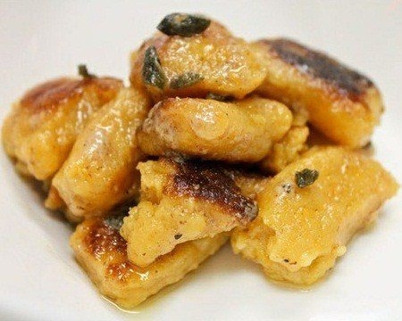 - Meanwhile, in a medium-sized saucepot, melt the butter over medium-low heat. Cook the butter until it starts to foam and milk solids start to bubble to the surface. The butter will begin to brown at this point; reduce the heat to low and add the sage. Using a medium-sized sauté pan, heat a little of the browned sage butter over high heat and fry the gnocchi in batches (about 3), until each gnocchi has a golden brown crust, about 5 minutes per batch. Add the gnocchi to a clean baking sheet and keep warm in the oven while you fry the rest of your batches, adding a little browned butter to the sauté pan as needed.